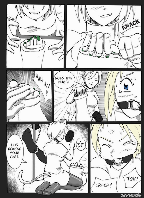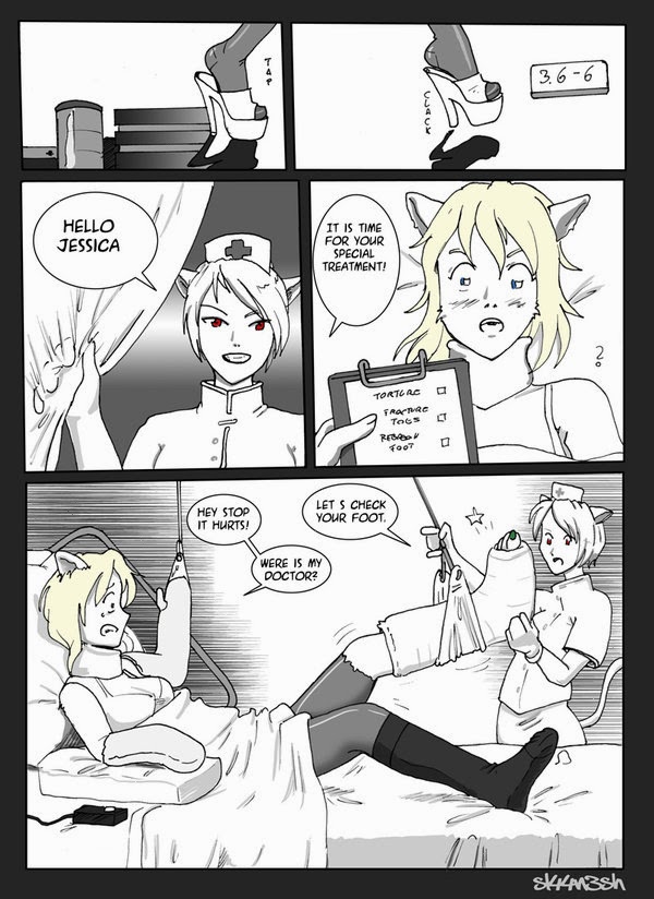 sl44n3sh did an amazing comic for jazzfox who has a casted foxgirl character who gets tortured by her catgirl nurse.