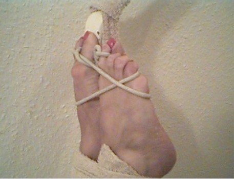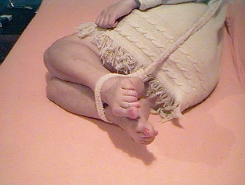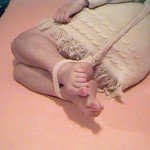 B01 – I have to admit that I like to be in bondage – the tighter, the better. The less I can move my legs and feet, the more it turns me on. Combined with a certain, well portioned degree of pain brings  “best results” for sexual gratification. The bondage you see is nofake at all. It was tight and painful. Alex bound my right second and baby toe to the opposite direction they are normally bent to – with no success, they are still bent. You can see all three corns on my right lesser toes.