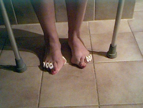CC04 – CC05) I was walking to the bathroom with crutches. It took me almost 3 minutes to get there…I could only walk very, very slow – not because it hurted (I got two injections), but because I couldn´t move my forefeet anymore. So I had to take care of not sliding my toes on the floor. Alex wrote that he was turned on by seeing my feet to be so helpless – that´s what they really were, and still are. When I saw my feet in the mirror in the bathroom I couldn´t believe how they looked. Seeing yourself in a mirror is always different…Standing on crutches with really crippled toes made me feel real helpless…
