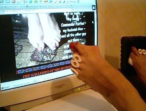 CC06) Alex begged me to go to the computer room for a moment to shoot this pic, while showing my feet on the screen with The Bunion Museum main page. He loves the pic, because the bulge of my bunion, it´s severity and size, and the angle of my big toe would be just perfect – HE SAID!!!