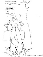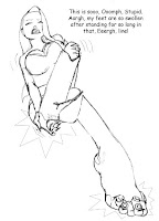 On the forums at bunionchat.cftb.net I came across the work of an artist who went by the name “jrfootman” who did a series of drawings about characters with painful corns, bunions and overlapping toes, caused by wearing too small, too tight, too high heels. I really love his work – and wish I could find more!